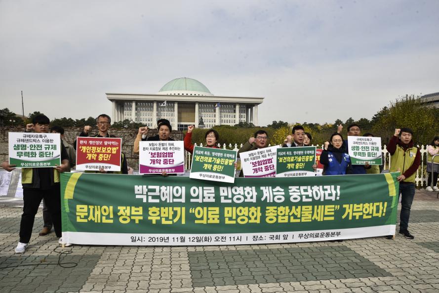 무상의료운동본부는 "환자 개인건강정보를 보험사 등 민간기업 돈벌이를 위해 팔아넘기고 병원을 영리병원으로 만드는 데에 문재인 정부와 더불어민주당·자유한국당·바른미래당이 이견이 없다는 게 문제다. 이 중 가장 적극적인 것은 정부다. 대통령 자신이 지난 시정연설에서 4차 산업혁명의 핵심이라며 '데이터'와 '바이오헬스' 규제완화를 지시했고 홍남기 부총리, 청와대 김상조 정책실장, 중소벤처기업부 박영선 장관 등이 모두 나서 개인정보 규제개악을 요구하고 있다. '혁신'이나 '4차 산업혁명'으로 포장하고 있지만 박근혜 적폐 개인정보 규제완화 시도와 판박이다"라고 지적했다.
