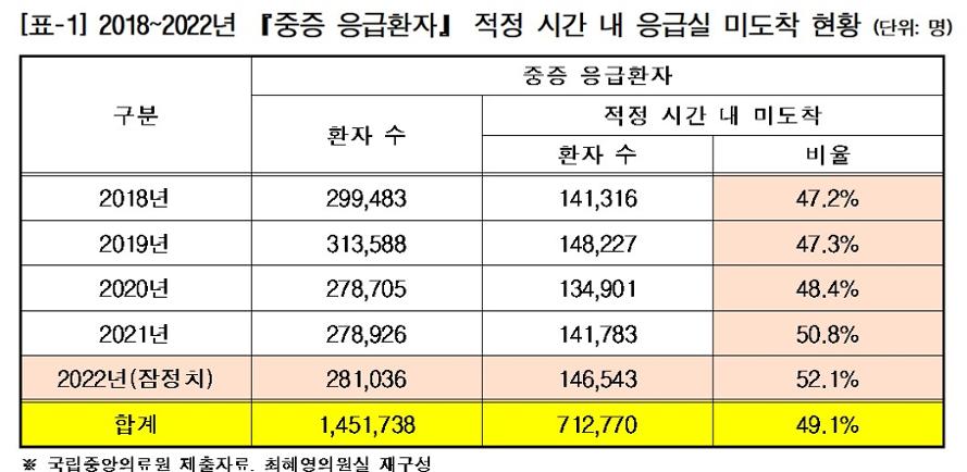 실제로 더불어민주당 최혜영 국회의원(국회보건복지위원회/예산결산특별위원회)이 국립중앙의료원으로부터 제출받은 자료에 따르면, 2018년부터 2022년까지 지난 5년간 145만 명의 중증 응급환자 중 49.1%에 달하는 약 71만 명의 중증 응급환자들(연평균 약 14만 명)이 적정 시간 내에 응급실에 도착하지 못한 것으로 나타났다.