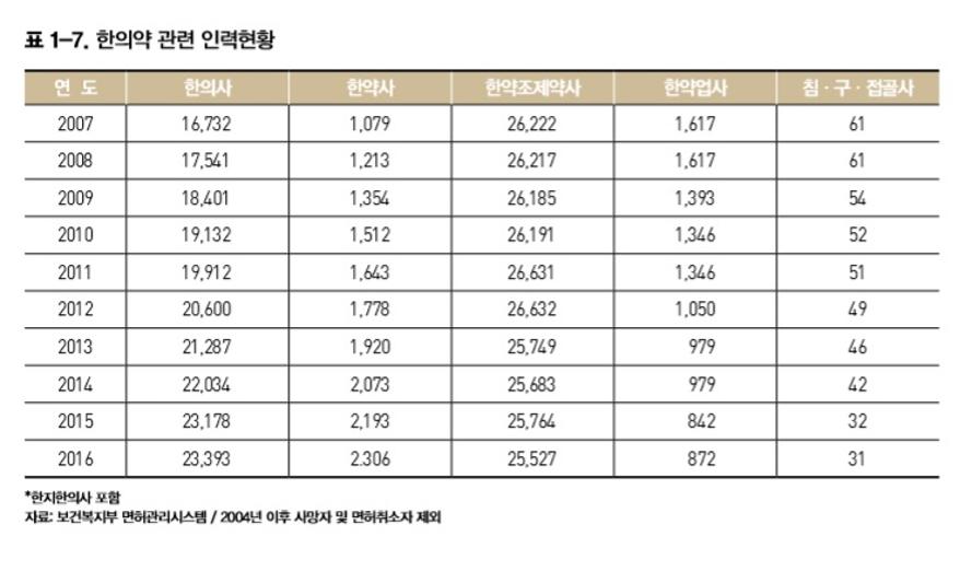 2016년 한의사 수는 2만3393명으로 2015년보다 215명(0.9%) 늘었다. 또 2007년 한의사수 1만6732명에 비해 40.2% 늘었다.