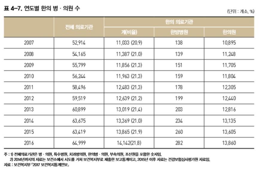 2016년 한의의료기관은 전년대비 381개 늘어난 1만4142개였다. 이 중 한의원 1만3860개와 한방병원 282개였다. 한의의료기관은 2007년 1만1033개소에서 매년 평균 357개씩 늘었다. 2016년 전체 의료기관 대비 한의의료기관의 비율은 21.8%로 전년대비 0.1%p 줄었다.