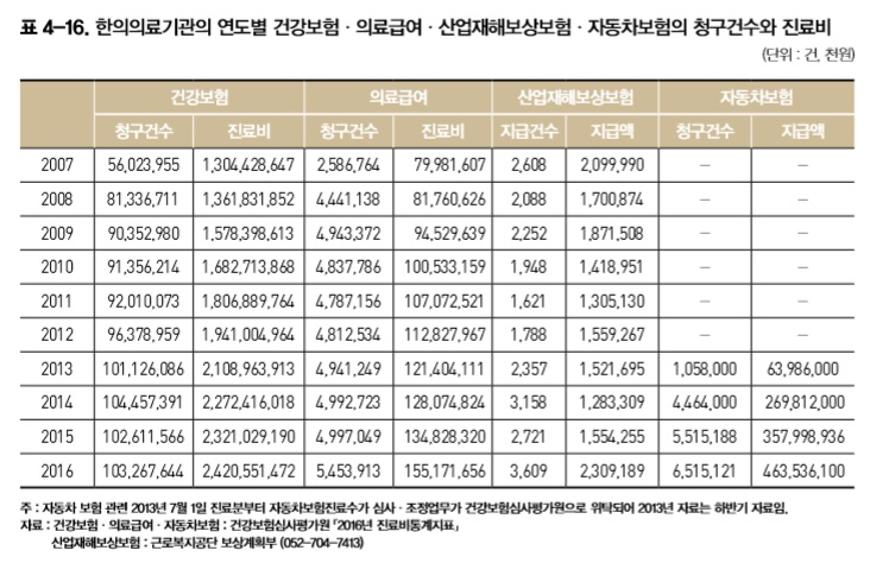 한의의료기관의 의료급여 청구액은 1551억7166만이었고 산재 보험 23억0919만원, 자동차보험은 4635억원이었다. 산재보험의 전체 급여지급액 대비 한의의료기관의 진료비 비율은 2016년 0.4%로 2007년 이후 가장 높았다. 자동차 보험의 전체 진료비 대비 한의의료기관 진료비 비율은 2013년 하반기 16.5%에서 꾸준히 늘어 2016년 27.9%를 차지했다.