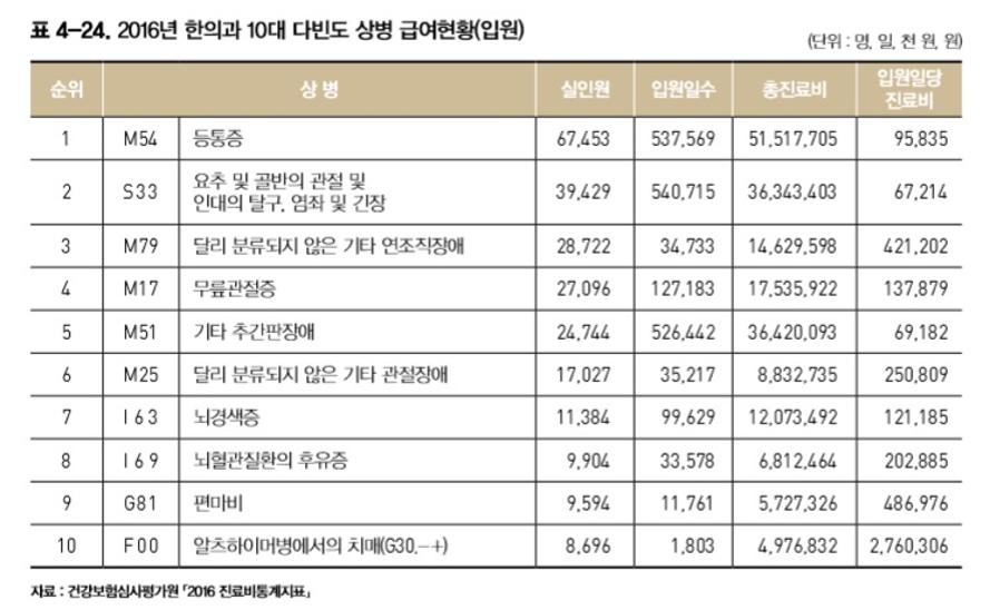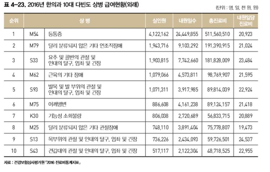 한의의료기관 외래 10대 다빈도 상병은 ‘등 통증’이 외래와 입원 모두 1위였다. 2013~2016년 다빈도 상병 1위는 매년 ‘등통증이었고, ’달리 분류되지 않은 기타 연조직 장애‘와 ’요추 및 골반의 관절 및 인대의 탈구, 염좌 및 긴장‘이 2·3위권을 유지했다. 매년 4~6위권은 ’발목 및 발부위의 관절 및 인대의 탈구, 염좌 및 긴장‘, ’어깨 병변‘의 실인원은 감소하는 추세였고 ’기타 근육 장애‘의 실인원은 대체로 늘었다. 10위 내 유일한 소화계통의 질환인 ’소화불량‘은 매년 7위를 유지했다.