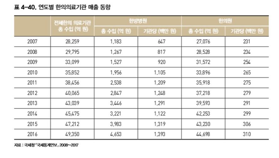 한의의료기관의 총수입은 2007년 2조8259억원에서 2016년 74.6%가 늘어난 4조9350억원이었다. 2016년 한의의료기관 총수입 중 한방병원의 총수입은 4653 원으로 9.4%를 차지했고, 한의원은 4조4698억원으로 90.6%를 차지했다. 한방병원의 총 수입은 2015년에 비해 670억원(16.8%)이 늘었고, 한의원의 총수입은 1468억원(3.4%)이 늘었다.