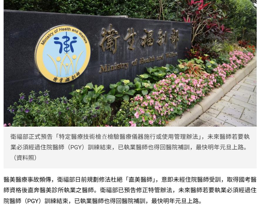 대만 현지 언론인 '민보(民報, Taiwan People news)'는 대만 보건복지부가 내년 1월 1일부터 레지던트 과정을 미이수한 의사에 대해 피부·미용 의료를 제한하는 법 개정안을 시행할 예정이라고 보도했다.
