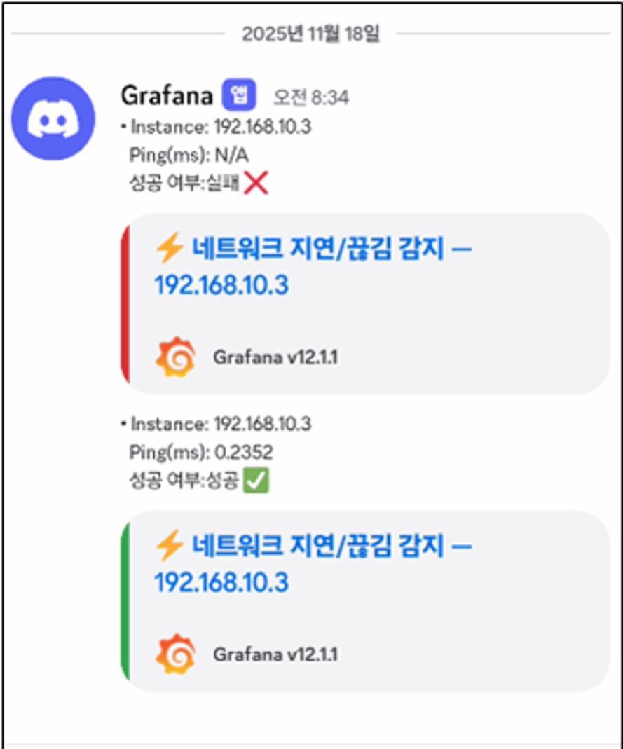 이 시스템은 Prometheus, Blackbox Exporter, Grafana 등 오픈소스 기술을 활용해 네트워크 장비의 연결 상태를 실시간으로 감시하고, 네트워크 지연 또는 끊김이 발생할 경우 즉시 관리자에게 스마트폰으로 알림을 전송한다.