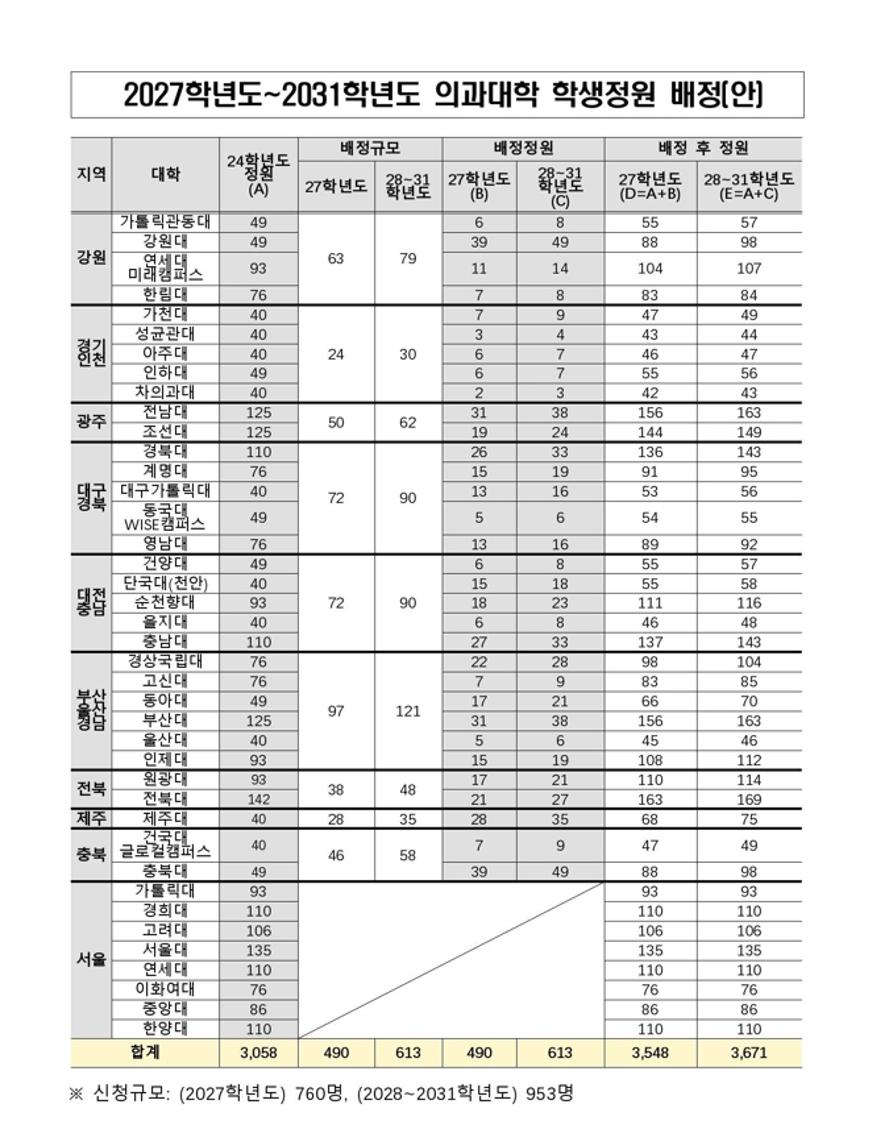 [메디게이트뉴스 박민식 기자] 교육부가 2027~2031학년도 의대정원 배정안을 13일 공개했다. 지역 국립대 위주 증원이 이뤄진 가운데 일부 대학의 경우 정원이 2배 늘어날 예정인 것으로 나타났다.