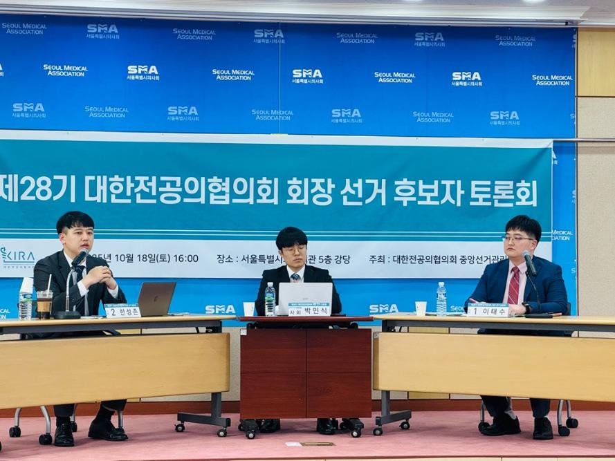 제28기 대한전공의협의회장 선거 후보자 토론회 제28기 대전협 회장 선거 후보자 토론회가 대전협 중앙선거관리위원회 주최, 메디게이트뉴스 박민식 기자 진행으로 18일 오후 4시 서울특별시의사회관에서 열렸다. 선거 투표는 2025년 10월 27일 오전 9시부터 10월 31일 오후 6시까지이며, 개표 및 당선인 공고는 31일 오후 7시 이후다. 기호 1번 이태수 후보는 연세의대를 졸업한 후 세브란스병원 인턴을 거쳐 현재 국민건강보험공단 일산병원 재활의학과 3년차다. 대한의료정책학교 1기 출신으로 대한병원의사협의회, 미래의료포럼 등 다양한 단체에서 활동하고 있다. 기호 2번 한성존 후보는 울산의대를 졸업한 성형외과 레지던트 3년차로, 현 대전협 비상대책위원장이다. 서울아산병원 전공의협의회 대표, 대전협 비대위원, 서울시의사회 정책이사를 지냈다.