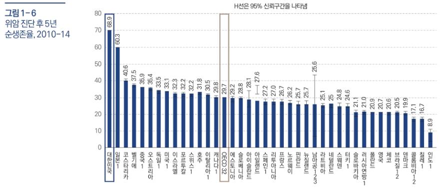 암의 진단 후 5년 순생존율은 한국이 68.9%로 경제협력개발기구(OECD) 국가 중 1위지만 브라질은 20.5%로 최하위권이다. 사진='OECD 국가의 의료의 질 지표 비교와 시사점' 보고서, 국회입법조사처.