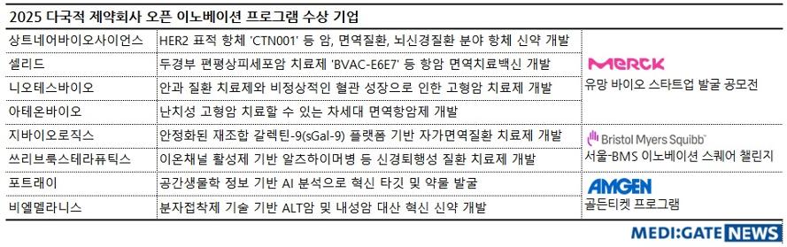 머크 라이프사이언스는 '2025 유망 바이오 스타트업 발굴 공모전'에서 4개 스타트업을 선정했고, 암젠코리아의 '2025년 골든티켓(Golden Ticket) 시상식'에서 2곳, 한국BMS제약의 '서울-BMS 이노베이션 스퀘어 챌린지(Seoul-BMS Innovation Challenge)'에서 2곳이 최종 우승을 차지했다.