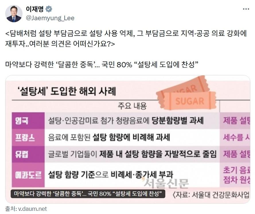 이 대통령은 28일 자신의 엑스(X·구 트위터)에 '마약보다 강력한 달콤한 중독…국민 80% 설탕세 도입에 찬성'이라는 제목의 기사를 공유하며 "담배처럼 설탕 부담금으로 설탕 사용을 억제하고, 그 부담금으로 지역·공공의료 강화에 재투자하는 것에 대한 의견은 어떤가요"라고 물었다.