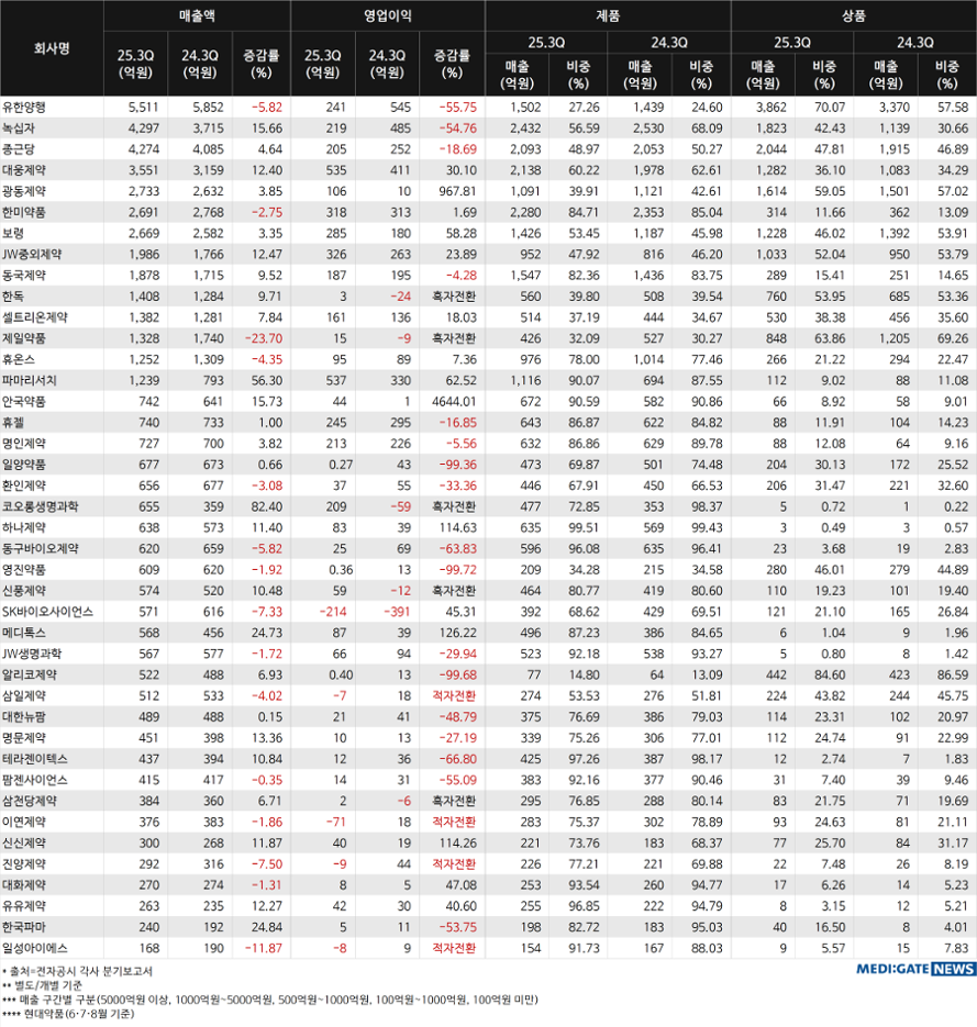 [메디게이트뉴스 이지원 기자] 국내 제약·바이오 기업의 2025년 3분기 실적을 분석한 결과, 제품 매출 확대가 매출 성장뿐 아니라 영업이익 개선까지 영향을 미치는 것으로 나타났다. 반면 상품 매출 중심 기업은 매출 증가에도 수익성이 개선되지 않으며 구조적 한계가 드러났다.