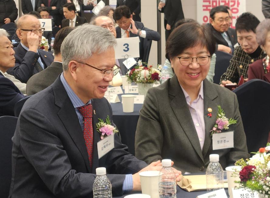 대한의사협회 김택우 회장과 보건복지부 정은경 장관이 8일 의료계 신년하례회에서 함께 앉아 있는 모습.