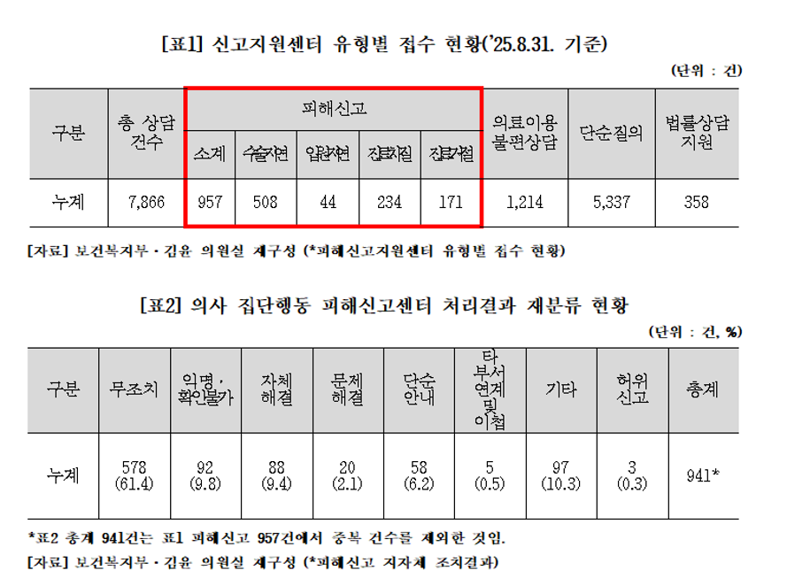 김윤 의원실이 복지부로부터 제출받은 피해신고센터 현황에 따르면, 2024년 2월 19일부터 2025년 8월 31일까지 센터에 접수된 총 상담 건수는 7866건이었다. 이 가운데 957건은 신고자가 ‘피해신고로 접수해 달라’고 요청한 사례였으며, 복지부는 이를 관할 지자체에 이첩해 조사·처리하도록 했다. 이후 복지부는 지자체가 회신한 결과를 반영해 956건을 종결 처리했다.
