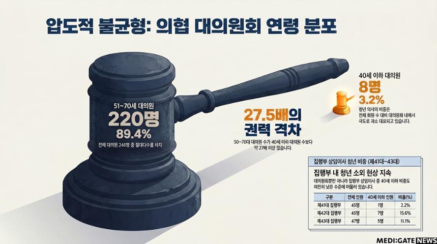 개정안의 배경은 수치로 드러난다. 의협 전체 회원 14만3050명 중 만 40세 이하 청년의사는 약 21.8%를 차지하지만, 대의원회(정수 250명) 내 비중은 약 3%에 불과하다. 만 50세 이하로 범위를 넓혀도 11% 수준이다.