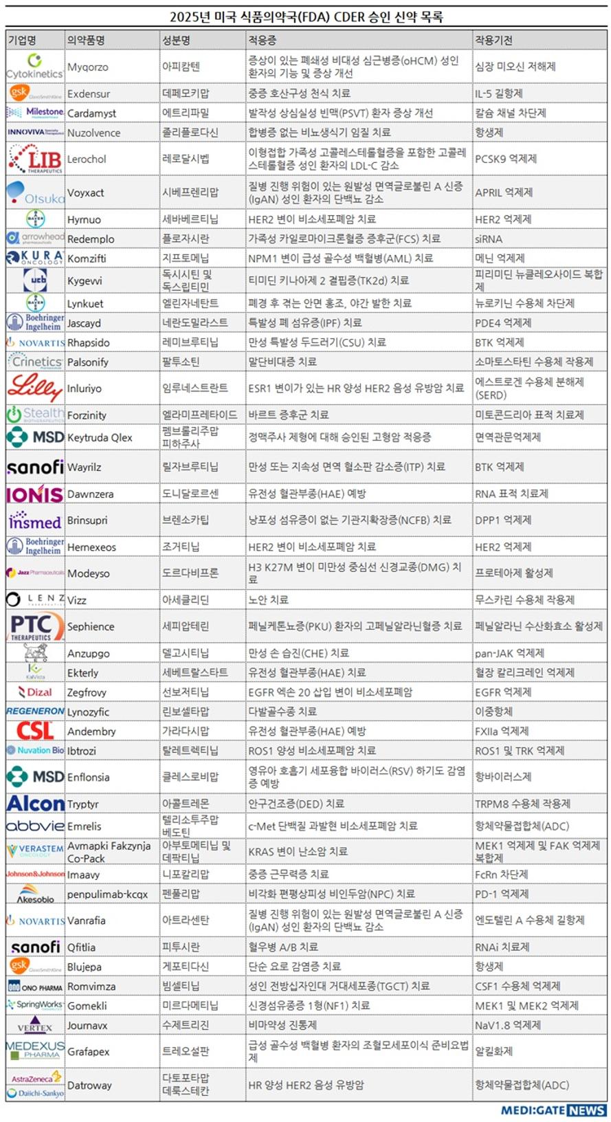 메디게이트뉴스는 CDER 자료를 바탕으로 2025년 허가된 주요 신약 정보를 종합했다.