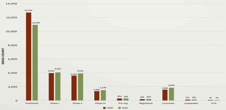 [메디게이트뉴스 이지원 기자] 2026년 글로벌 의약품 파이프라인 수가 2만2940개로 집계되며 1990년대 중반 이후 처음으로 감소한 것으로 나타났다. 다만 전임상 단계 약물은 줄었지만, 임상 1·2·3상 진입 약물은 늘어 후기 단계 중심으로 연구개발이 재편되는 흐름이 확인됐다.