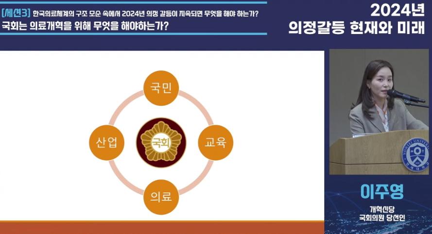 이주영 당선인은 이날 '2024년 의정갈등 현재와 미래' 연세의대 심포지엄에서 "의료계가 앞으로 국민 속에서 전문가 집단으로 미래를 주도하기 위해선 협의체를 주도적으로 운영할 필요가 있다"며 "현재 대통령 직속 의료개혁특위가 불합리한 부분이 많은 것은 맞다. 그러나 특위를 보이콧하려면 대한의사협회나 교수, 전공의 단체 등이 모여 함께 추가 논의가 필요해 보인다"고 말했다.