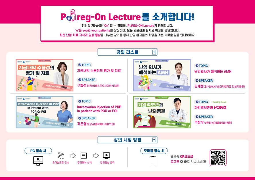 강의명인 'P(u)reg-On Lecture'는 '임신의 가능성을 켜다(On)'라는 의미의 'Pregnancy-On'에 한국오가논의 대표 난임 치료제 '퓨레곤(Puregon)'을 더해 만들어졌다. 특히 강의명에 포함된 '(u)'는 의료진(you)과 그들의 환자(your patients)를 상징하며, 난임 치료 여정에 있는 모든 이들을 향한 응원의 뜻을 담고 있다.