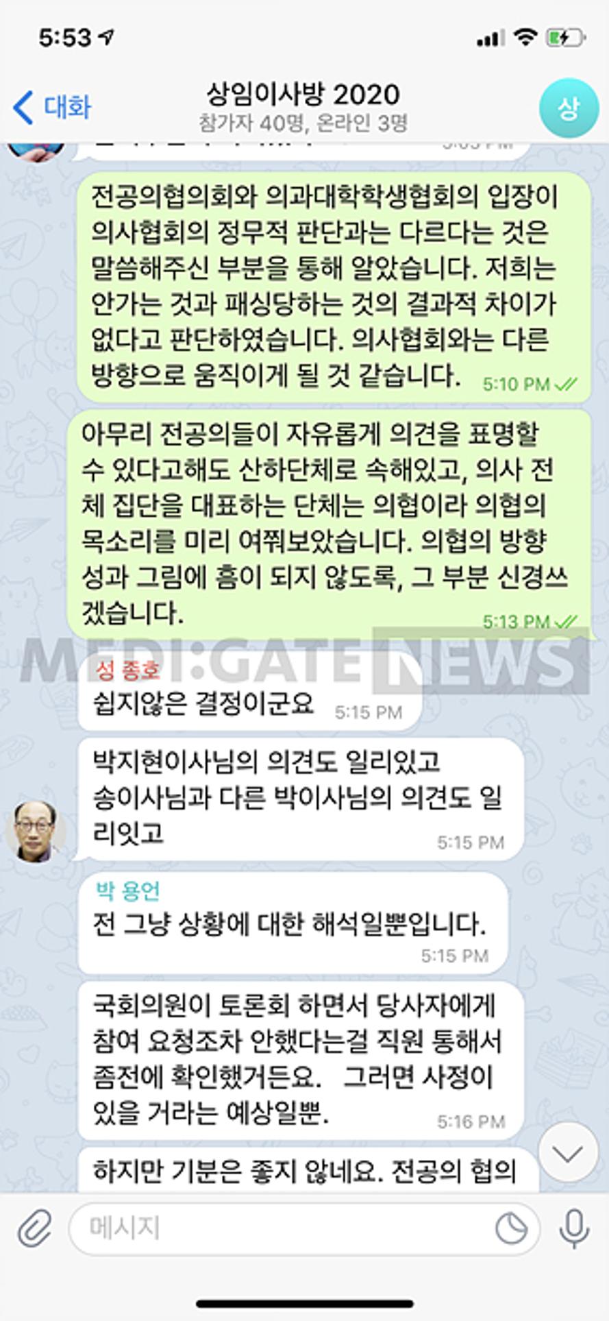 또한 메신저 대화방은 두번 나간 적이 있다. 첫 번째는 6월 김원이 의원 토론회 당시 의협이 국회의 의료전문가 패싱을 묵인한 사안에 대한 불만이었고 두 번째는 9.4 졸속합의 이후다.