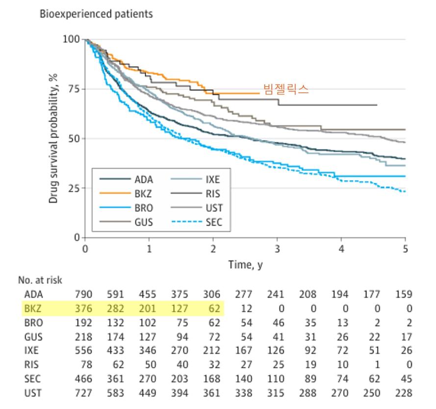 덴마크 건선 환자의 생물의약품 치료 지속성을 평가한 전국 단위 코호트 연구에서 빔젤릭스가 다른 생물의약품 대비 치료 지속성(Drug Survival)이 높게 나타난 것으로 나타났다.