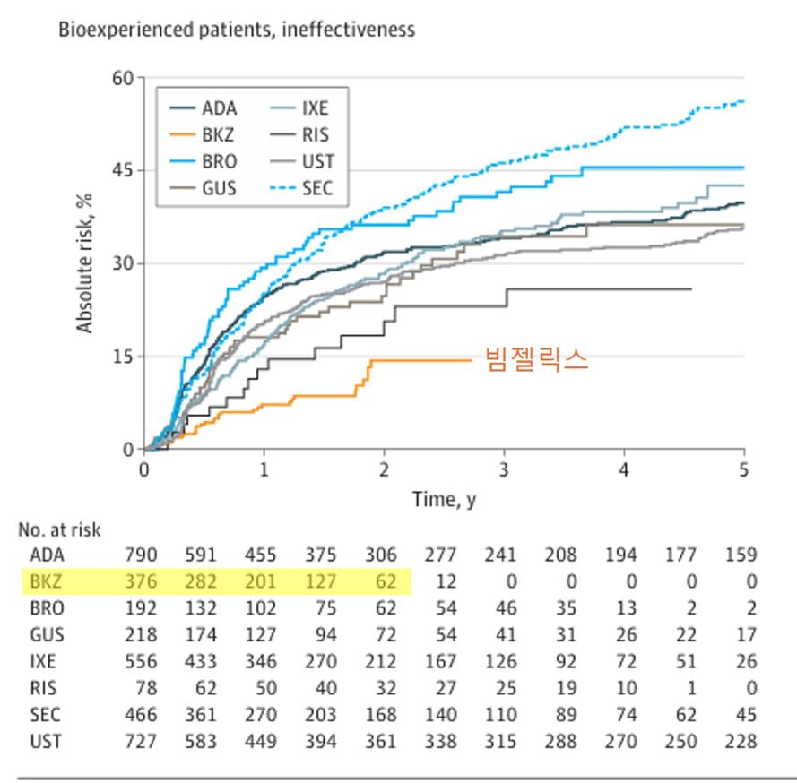 연구 결과 과거 생물의약품 치료 경험이 있는 환자군에서 치료 지속성은 빔젤릭스가 다른 생물의약품 대비 1년이 지나 2년이 지난 시점까지 비교적 높은 수준으로 유지되는 것이 확인됐다. 또한 효과 부족으로 인한 치료 중단 위험 역시 빔젤릭스가 다른 생물의약품 대비 1년이 지난 2년까지 낮은 위험군으로 나타났다.