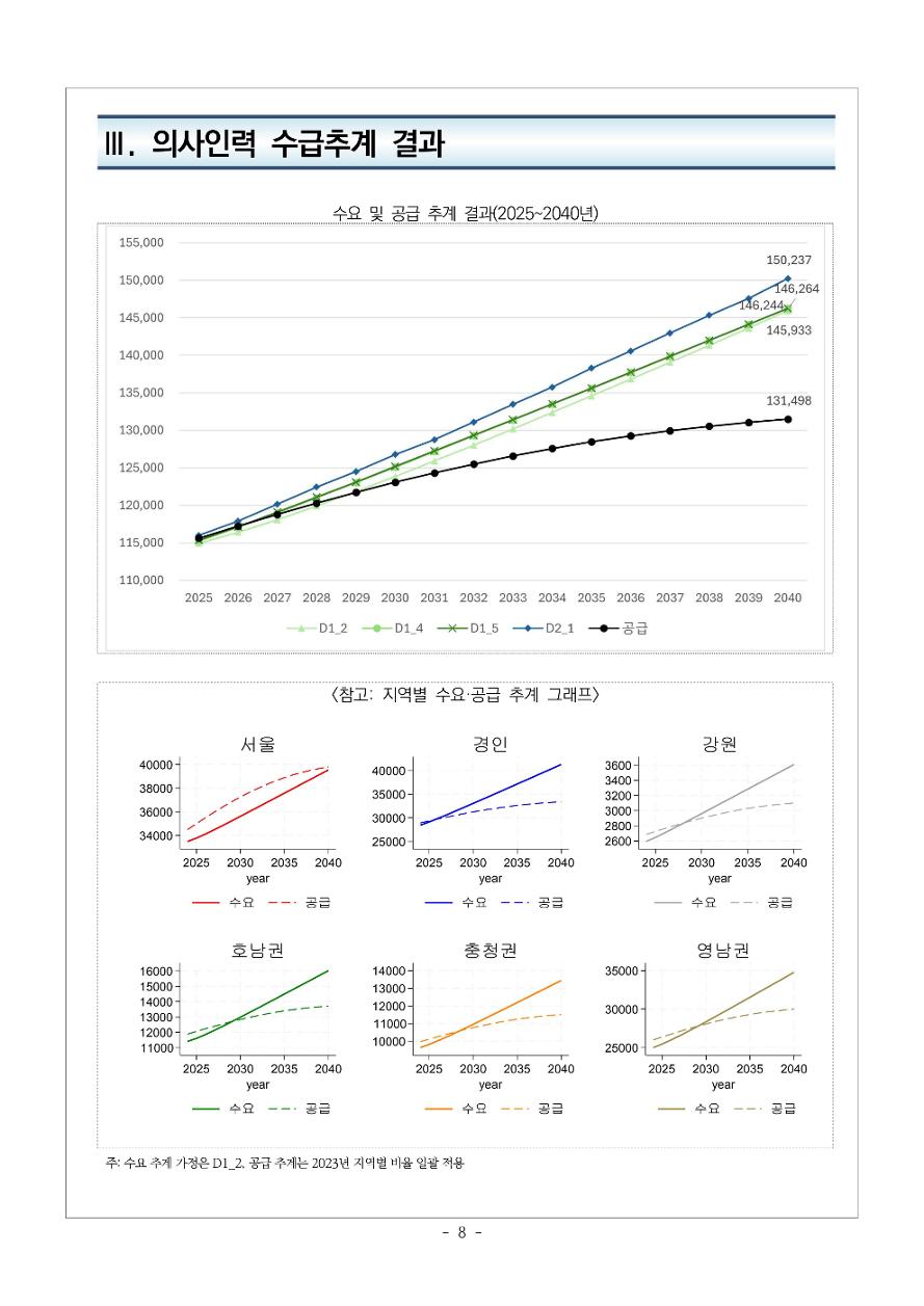 앞서 보사연은 지난 추계위 제9차 회의에서 2040년 예상 의사 공급 13만1498명, 의사 수요 (14만5933명~15만237명)를 비교해 최소 1만4435명에서 최대 1만8739명의 의사가 부족할 것으로 산출했다. 특히 서울은 의사 공급이 부족하지 않은 반면, 지역은 수요 대비 공급이 크게 부족한 것으로 나타났다.
