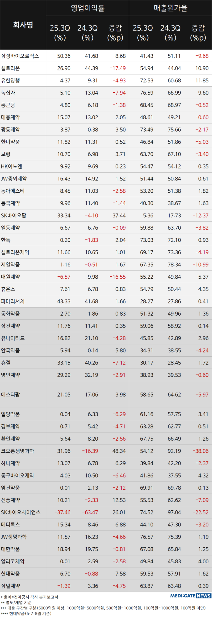 영업이익률 높이고 매출원가율 줄인 '진짜 실적 개선 기업'은? 삼성바이오·대웅·광동 등