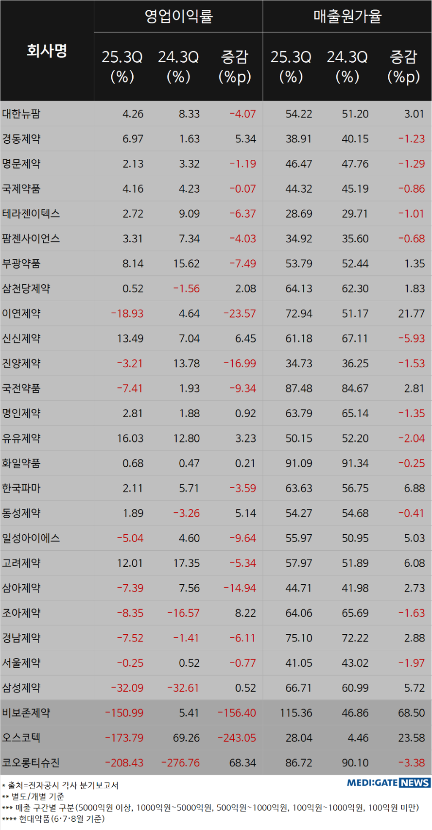올해 3분기 영업이익률이 낮아지고, 매출 대비 원가 부담은 커진 기업은 총 28개사로, 셀트리온·유한양행·GC녹십자 등이 있다. 수익성 악화와 마진 붕괴뿐 아니라 외형까지 역성장한 기업은 17개사로 집계됐다.