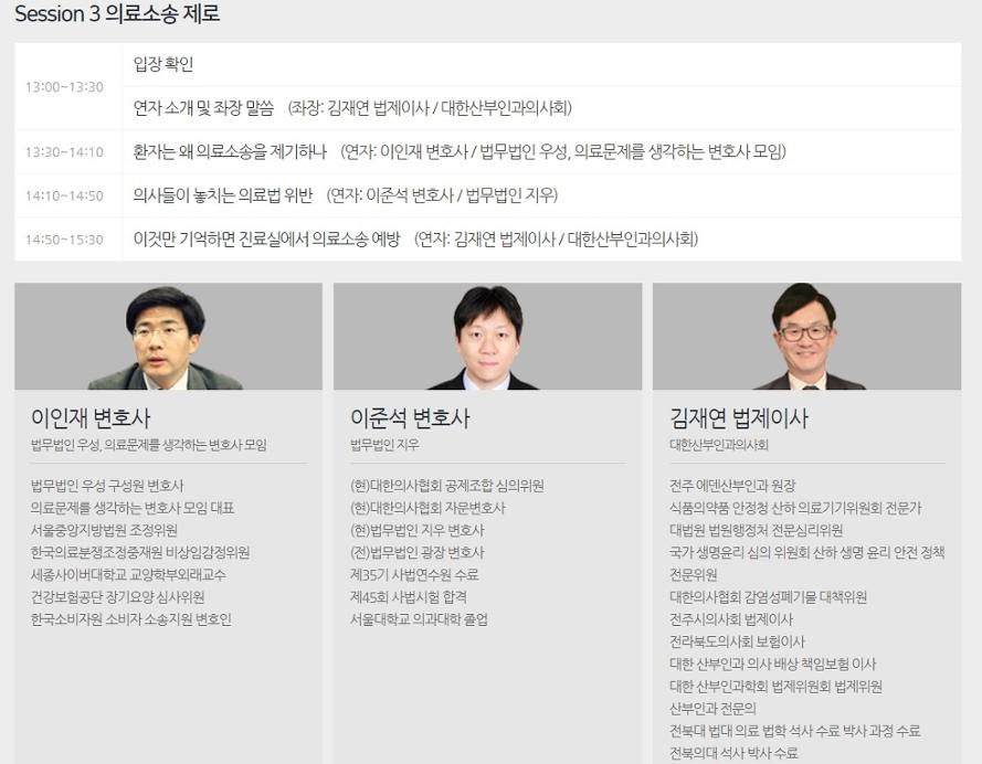‘의료소송 제로’ 세션은 최근 늘어나는 진료실과 진료현장에서 발생하기 쉬운 의료소송을 미리 대비하고 예방할 수 있는 방법을 알아본다. 김재연 대한산부인과의사회 법제이사를 좌장으로 ▲환자는 왜 의료소송을 제기하나 (이인재 법무법인 우성 변호사, 의료문제를 생각하는 변호사 모임 대표) ▲의사들이 놓치는 의료법 위반 (이준석 법무법인 지우 변호사 겸 의사) ▲이것만 기억하면 진료실에서 의료소송 예방 (김재연 대한산부인과의사회 법제이사) 등이다.