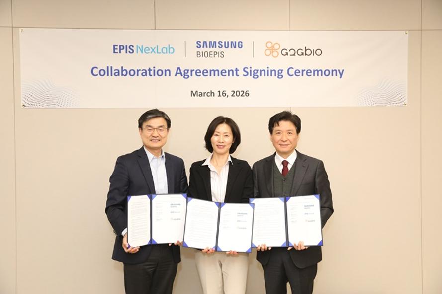 사진: 삼성바이오에피스 김경아 사장(가운데), 홍성원 부사장(왼쪽, 에피스넥스랩 대표), 지투지바이오 이희용 대표(오른쪽)가 바이오 신약 및 기술 플랫폼 공동 개발을 위한 계약을 체결하고 기념 사진을 촬영하고 있다.