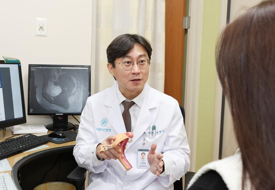 서울아산병원 산부인과 조현웅 교수가 하이펙 치료를 받은 3기 난소암 환자를 진료하고 있다.