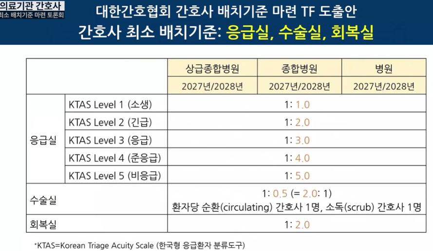 응급실의 경우는 모든 의료기관에서 한국형 응급환자 분류도구 KTAS 레벨1(소생)은 1:1, 레벨2(긴급)는 1:2, 레벨3(응급)은 1:3, 레벨4(준응급)는 1:4, 레벨5(비응급)은 1:5 비율이 필요한 것으로 나왔다.