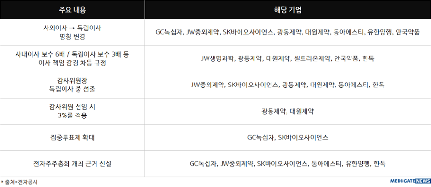 이에 따라 GC녹십자, JW중외제약, SK바이오사이언스, 광동제약, 대원제약, 동아에스티, 유한양행, 안국약품 등은 정관 변경을 통해 이사회 구성 요건을 강화한다. 한독은 기존 '사외이사 2인 이상' 규정을 '독립이사 3분의 1 이상'으로 개정할 방침이다.