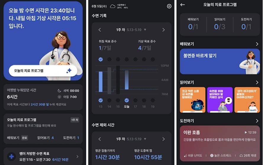 더불어 수면제한요법에 기반해 자체 개발한 알고리즘으로 개인의 상태를 분석하고, 맞춤형 취침·기상 시간을 처방한다. 전문 상담사와 1:1 콜과 수면 스케줄 관리 및 수면 기록, 전문의가 설계한 진도별 학습 콘텐츠를 통해 6주 동안 밀착 관리하면서 수면 회복을 돕는다.