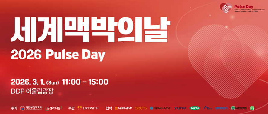 [메디게이트뉴스 이지원 기자] 대한부정맥학회가 3월 1일 서울 DDP 어울림광장에서 '세계 맥박의 날(Pulse Day) 2026' 행사를 개최한다고 밝혔다. 공간과나눔과 함께 공동 주최하는 이번 행사는 세계 맥박의 날을 기념해 마련됐으며, 부정맥에 대한 올바른 이해와 조기 발견의 중요성을 일반 시민에게 알리는 것을 목표로 한다.