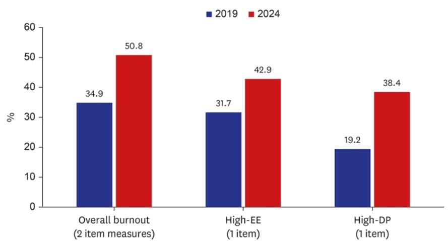 또한 "특히 외과 분야는 큰 타격을 입었다. 외과 전공의 지원 미달과 높은 업무 강도가 밀접하게 연관돼 현재 의료 위기 상황은 한국 외과의사들의 번아웃을 더욱 심화시키고 있다. 번아웃에 가장 큰 영향을 미치는 요인은 주간 근무 시간으로, 여성 외과 의사는 의료대란 기간 동안 번아웃 수준이 더 높았고 번아웃 증가 폭도 컸다. 향후 여성 의사의 번아웃 원인 조사와 대응책을 찾기 위한 연구가 더 필요하다"고 제언했다.