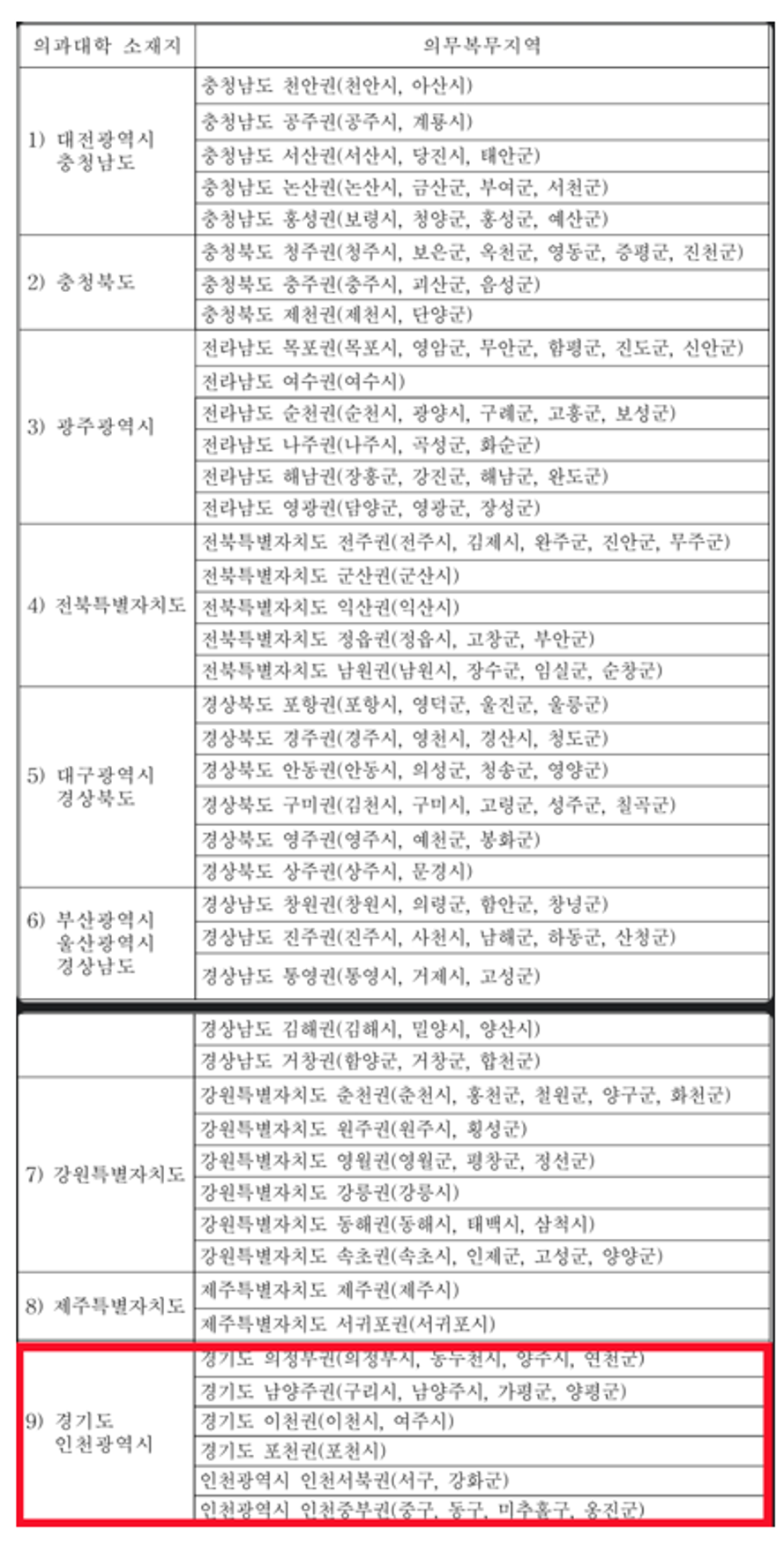 그렇다면 어느 지역으로 이동을 하려고 할 것인가? 해당 법률의 시행령에는 의과대학 소재지 별 의무복무지역을 다음과 같이 규정하고 있다.