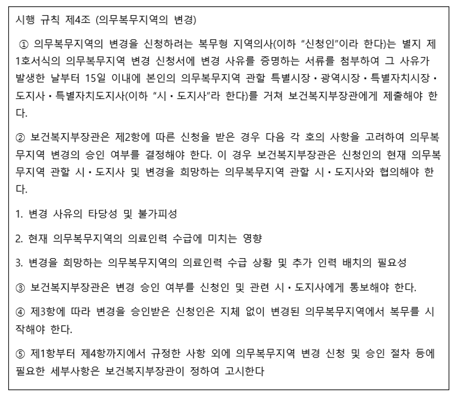 일반적으로 복무형 지역의사제인 경우 10년간 해당지역에 고정돼 있을 것으로 생각한다. 하지만 의무복무지역의 변경을 신청할 수 있고, 이를 시도지사를 통해 보건복지부장관 승인 하에 변경이 가능하다. 변경을 위한 신청 사유는 규정돼 있지 않으며, 승인 결정시 고려해야 할 사항만 규정돼 있다.