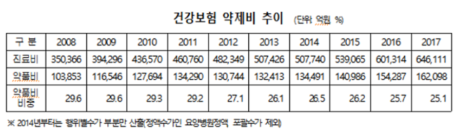 19일 국회 보건복지위원회 남인순 의원(더불어민주당)이 건강보험심사평가원에서 제출받은 자료에 따르면, 한국은 진료비 중에서 약품비 사용 비중이 25.1%로, 경제협력개발기구(OECD) 국가 평균인 20%보다 높았다.