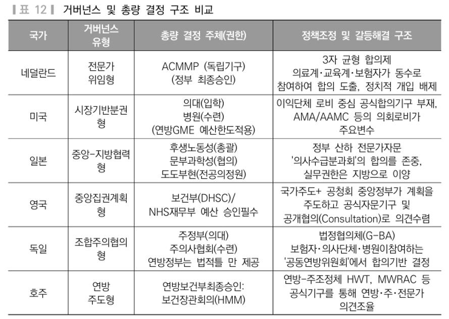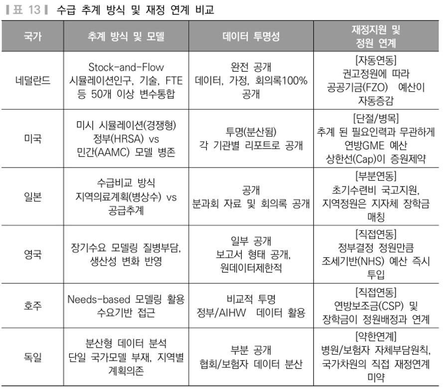 연구 결과, 국가마다 다양한 형태를 취하지만, 의사인력 수급 추계에 있어 총량을 결정하는 방식은 전문가 주도 독립성과 재정 연계가 핵심이다.