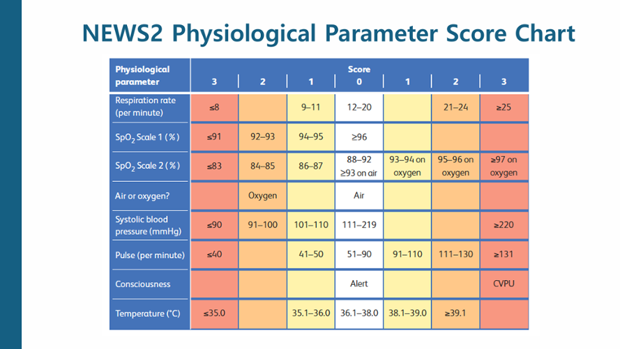 NEWS는 호흡수, 산소포화도, 혈압, 맥박, 체온, 의식 수준 등 기본 생체징후를 기반으로 환자 상태를 점수화하는 조기경보 시스템이다. 각 지표 이상 정도에 따라 0~3점 가중치를 부여해 총점으로 환자 상태 위험도를 평가한다.