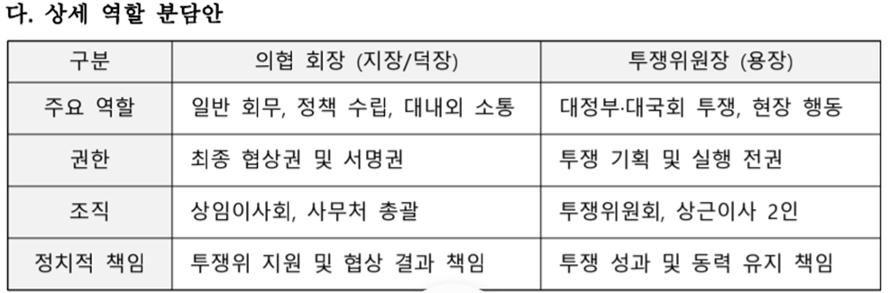 그는 "이런 상황에서 또 다른 상설 투쟁기구를 만드는 것은 권한은 분산시키고 책임은 흐리는 결과를 낳을 것"이라며 "결국 회장의 면피용 장치로 작동할 가능성이 크다"고 비판했다.