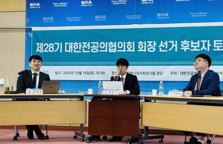 제28기 대한전공의협의회장 선거 후보자 토론회 제28기 대전협 회장 선거 후보자 토론회가 대전협 중앙선거관리위원회 주최, 메디게이트뉴스 박민식 기자 진행으로 18일 오후 4시 서울특별시의사회관에서 열렸다. 선거 투표는 2025년 10월 27일 오전 9시부터 10월 31일 오후 6시까지이며, 개표 및 당선인 공고는 31일 오후 7시 이후다. 기호 1번 이태수 후보는 연세의대를 졸업한 후 세브란스병원 인턴을 거쳐 현재 국민건강보험공단 일산병원 재활의학과 3년차다. 대한의료정책학교 1기 출신으로 대한병원의사협의회, 미래의료포럼 등 다양한 단체에서 활동하고 있다. 기호 2번 한성존 후보는 울산의대를 졸업한 성형외과 레지던트 3년차로, 현 대전협 비상대책위원장이다. 서울아산병원 전공의협의회 대표, 대전협 비대위원, 서울시의사회 정책이사를 지냈다.