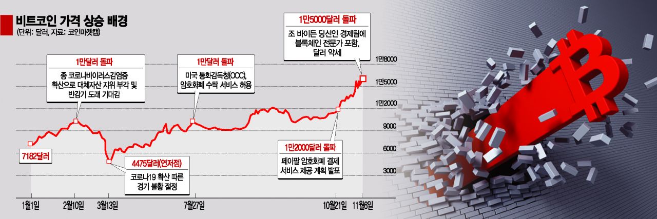 지난 2월에도 1만달러를 돌파한 적이 있지만 이는 신종 코로나바이러스감염증(코로나19) 확산으로 대체자산 지위가 부각돼 나타난 반사이익이었다. 코로나19 팬데믹(세계적 대유행)이 절정이었던 3월 들어서는 결국 비트코인 가격도 무너지며 4000달러대로 주저앉은 것도 이 같은 맥락에서다.