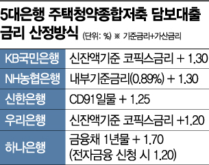NH농협은행은 내부기준금리(0.89%)에 추가 1.30%, 신한은행은 CD91일물에 추가 1.25%, 하나은행은 금융채 1년물에 추가 1.20~1.70%를 가산금리로 붙이는 방식으로 대출금리를 정하고 있다.