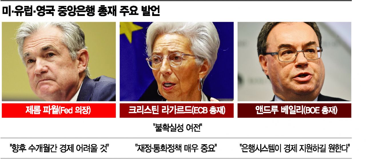 신종 코로나바이러스감염증(코로나19) 백신 개발에 한발 다가섰다는 소식에도 미국, 유럽, 영국 등 주요 중앙은행 총재들은 경계 태세를 좀처럼 거두지 않고 있다. 백신 개발에 성공하더라도 대량생산과 보급까지 여전히 갈 길이 먼 만큼 단기간 내 경기 회복을 기대하기 어렵다는 판단 때문이다. 오히려 세계 곳곳에서 코로나19가 재확산하는 상황을 언급하며 "경제에 주요한 리스크"라고 평가했다.