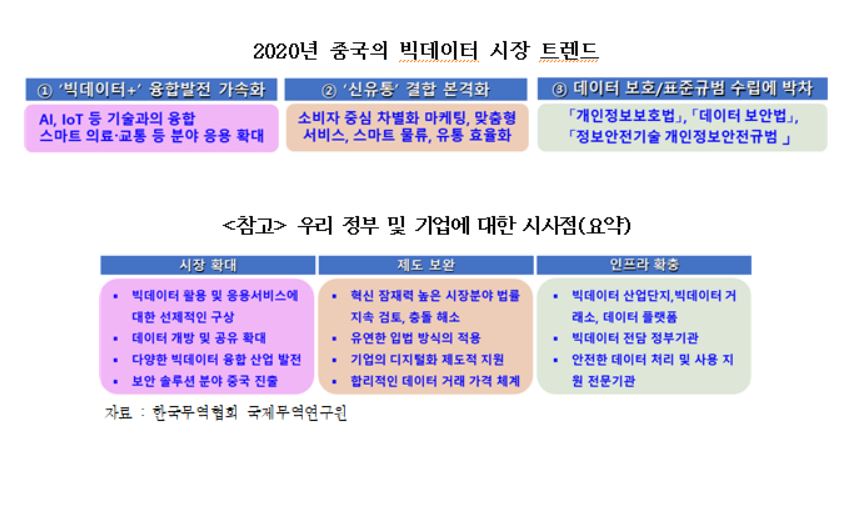 보고서는 "최근 중국 빅데이터 시장 트렌드는 '빅데이터+' 융합 발전 가속화, 신유통 결합 본격화, 데이터 보호·표준규범 수립"이라며 "중국이 자국 데이터 통제와 중국 중심의 표준규범 수립에 박차를 가하면서 중국 시장 확대를 도모하는 해외기업에 제동을 걸고 있어 주의가 필요하다"고 말했다.