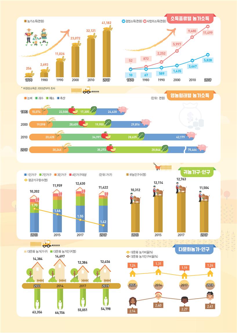 농가소득은 꾸준히 증가세를 보였다. 지난 50년간(1970년~2019년) 농가소득은 겸업소득이 연평균 14.0%, 사업외소득 11.6%, 농업소득이 8.4% 증가했다. 영농형태를 기준으로 살펴보면 지난 27년(1998년~2019년) 동안 축산농가가 연평균 4.4%, 논벼 2.7%, 채소 2.0%, 과수 1.7%, 특용작물 0.9%의 증가세를 기록했다. 지난 18년간(2002년~2019년) 농축산물 판매액이 1억원 이상인 농가는 연평균 8.0% 증가했고, 10a(1000㎡)당 생산비는 논벼가 연평균 8.1%, 콩 6.4%, 고추 5.8%, 마늘 및 양파가 각 5.1% 상승했다.