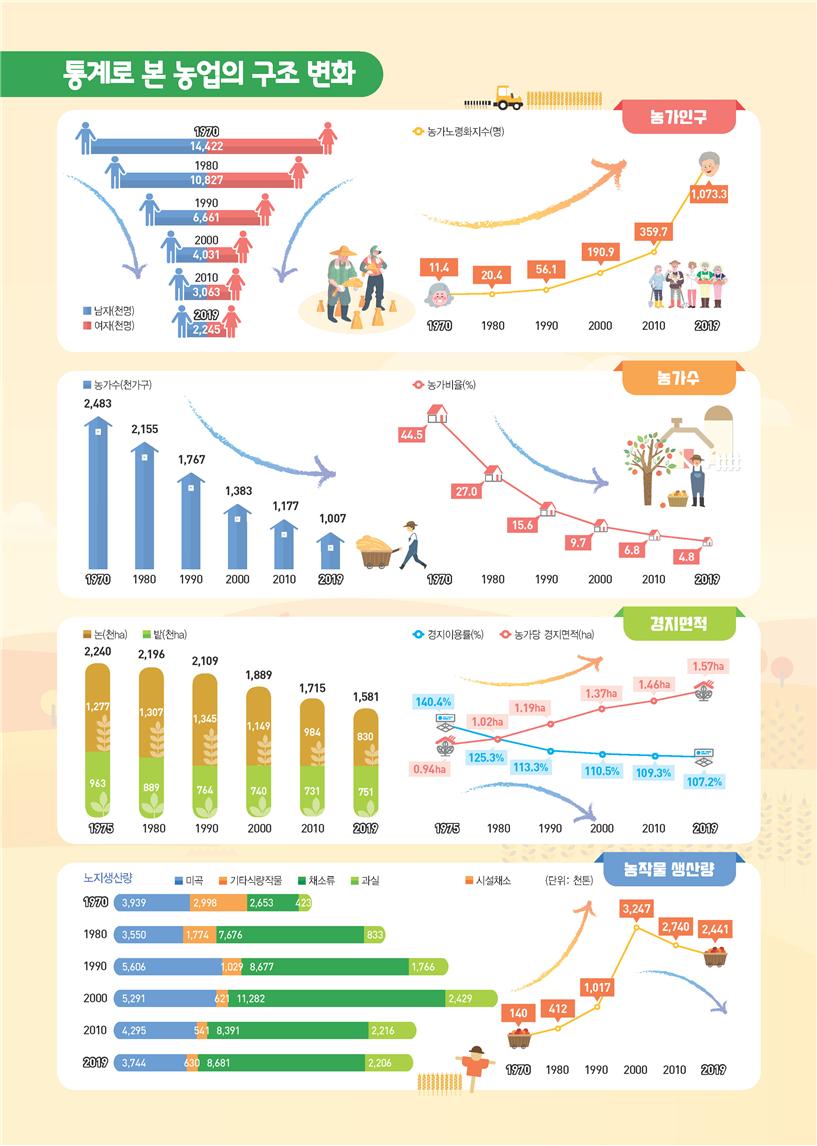 농가 인구 역시 지난 50년간 꾸준한 감소세를 기록중이다. 연평균으로 따지면 농가인구는 3.7%, 농가수는 1.8%씩 줄었다. 지난해 농가인구는 224만5000명으로 1970년 1442만2000명에 비해 1217만7000명(-84.4%) 감소했다. 전체인구(5177만9000명) 중 농가인구가 차지하는 비중은 4.3%로 1970년(45.9%)에 비해 41.6%포인트 줄었다. 농가 수 또한 2019년 100만7000가구로 1970년 248만3000가구에 비해 147만6000가구(-59.4%) 감소했다.