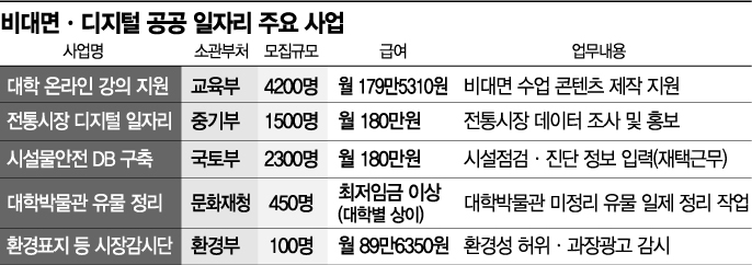 채용 인원이 가장 많은 사업은 교육부의 대학 온라인 강의 지원 사업이다. '온라인 원격 도우미'라는 이름으로 4200명이 대학의 2학기 원격수업 지원 업무를 하게 된다. 이달 말부터 각 대학에서 채용 공고를 내고 6~15명가량의 인력을 뽑는다. 원격교육에 익숙지 않은 교수를 도와 동영상 편집, 자막 만들기와 같은 일을 한다. 주 40시간 일하면 최저임금 수준인 179만5310원을 받는다. 20대 미취업자, 휴학생만 지원 가능하도록 했으며 교육부와 대학 간에 계약을 맺는 방식이어서 고졸 구직자는 소외될 수밖에 없다.